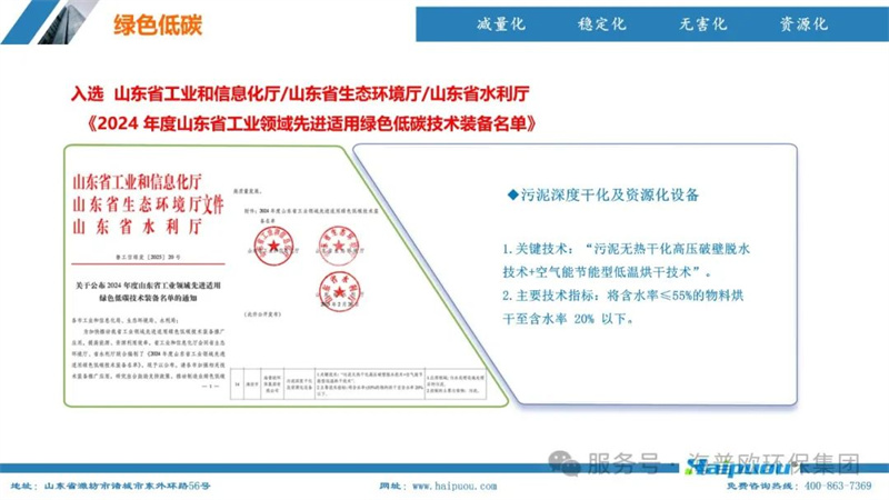 海普歐環(huán)保在污泥處理領域擁有10項發(fā)明專利,其“污泥資源化利用關鍵技術研發(fā)及產業(yè)化”項目更是榮獲山東省企業(yè)科技創(chuàng)新協(xié)會科技創(chuàng)新獎優(yōu)秀項目二等獎。集團憑借其在環(huán)保領域的突出貢獻和技術創(chuàng)新,成功入選山東省工業(yè)和信息化廳、山東省生態(tài)環(huán)境廳、山東省水利廳聯(lián)合發(fā)布的《2024年度山東省工業(yè)領域先進適用綠色低碳技術裝備名單》