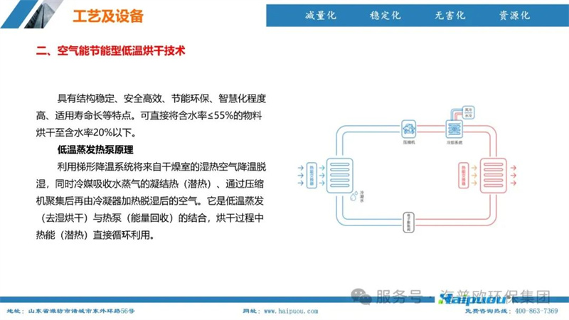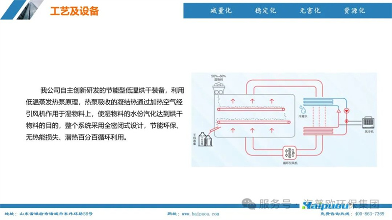 海普歐環(huán)保的核心技術——污泥深度干化及資源化設備,采用了“污泥無熱干化高壓破壁脫水技術+空氣能節(jié)能型低溫烘干技術”。這一技術組合能夠將含水率≤55%的物料烘干至含水率20%以下,為污泥的后續(xù)資源化利用提供了堅實的技術支撐。其中,污泥無熱干化高壓破壁脫水技術通過自主研發(fā)的高壓破壁泵,在污泥輸送過程中完成壓力破壁,破壞污泥中微生物細胞的細胞膜,使內部小分子滲出變?yōu)橥獠克黾游勰嗟牧鲃有,便于脫水。而空氣能?jié)能型低溫烘干技術則利用低溫蒸發(fā)熱泵原理,將濕熱空氣降溫脫濕,同時冷媒吸收水蒸氣的凝結熱,通過壓縮機聚集后再由冷凝器加熱脫濕后的空氣,實現熱能的循環(huán)利用,具有節(jié)能環(huán)保、安全高效、智慧化程度高等特點