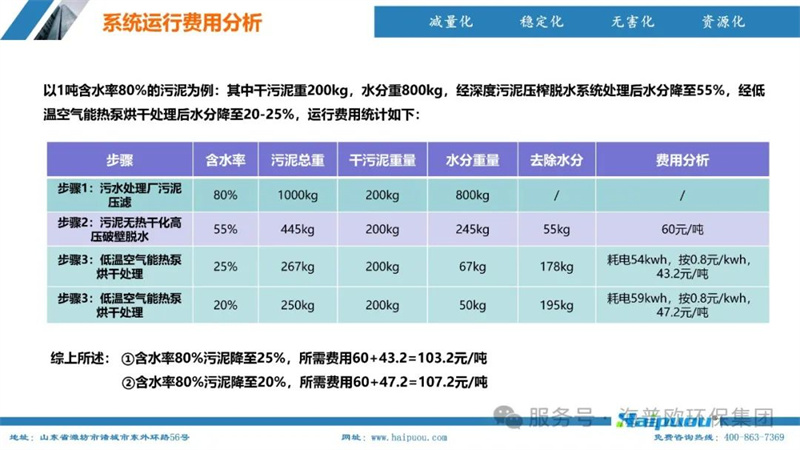 在項目實踐中,海普歐環(huán)保依托先進的技術裝備和專業(yè)的服務團隊,為市政污泥、管網污泥、工業(yè)污泥、河湖淤泥等多種污泥的處理提供了高效的解決方案。其污泥深度干化及資源化設備能夠將污泥含水率降至20%以下,使污泥顆粒的低位熱值達到2200-3500Kcal/kg以上,可作為生物質鍋爐燃料或摻混進入循環(huán)流化床鍋爐燃燒,實現了污泥的減量化、無害化和資源化利用。以1噸含水率80%的污泥為例,經過深度污泥壓榨脫水系統(tǒng)處理后,含水率降至55%,再經低溫空氣能熱泵烘干處理,含水率可進一步降至20-25%,運行費用僅為103.2-107.2元/噸,具有顯著的經濟和環(huán)境效益。