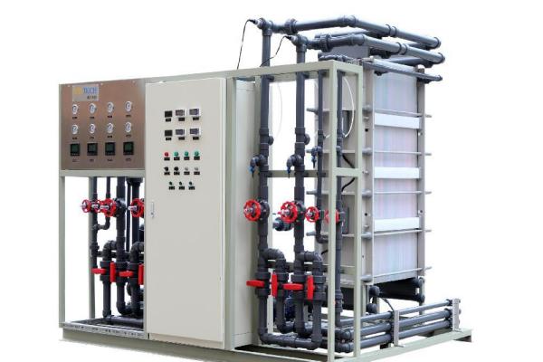 在電滲析過程中,離子交換膜不像離子交換樹脂那樣與水溶液中的某種離子發(fā)生交換,而只是對不同電性的離子起到選擇性透過作用,即離子交換膜不需再生。電滲析工藝的電極和膜組成的隔室稱為極室,其中發(fā)生的電化學(xué)反應(yīng)與普通的電極反應(yīng)相同。陽極室內(nèi)發(fā)生氧化反應(yīng),陽極水呈酸性,陽極本身容易被腐蝕。陰極室內(nèi)發(fā)生還原反應(yīng),陰極水呈堿性,陰極上容易結(jié)垢。